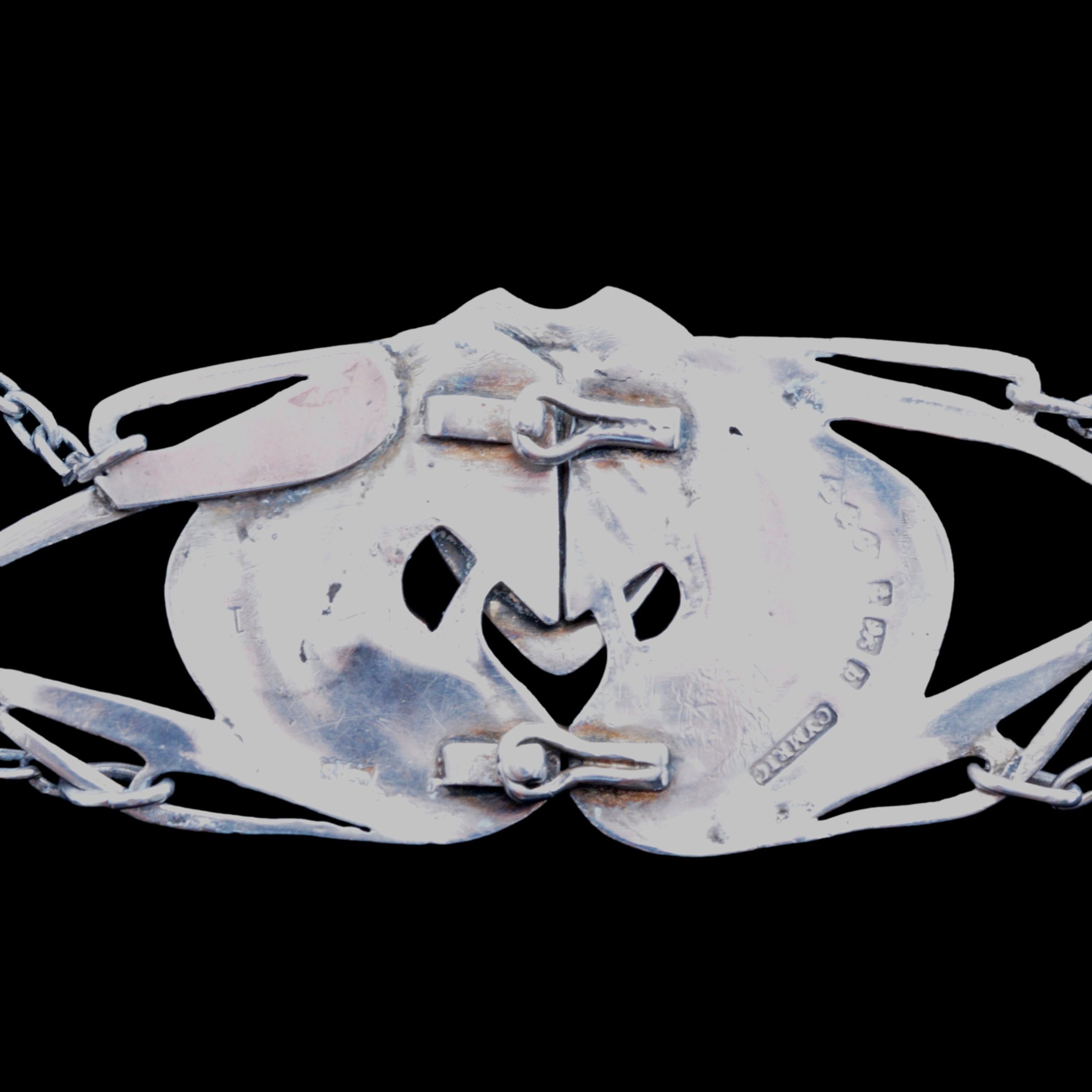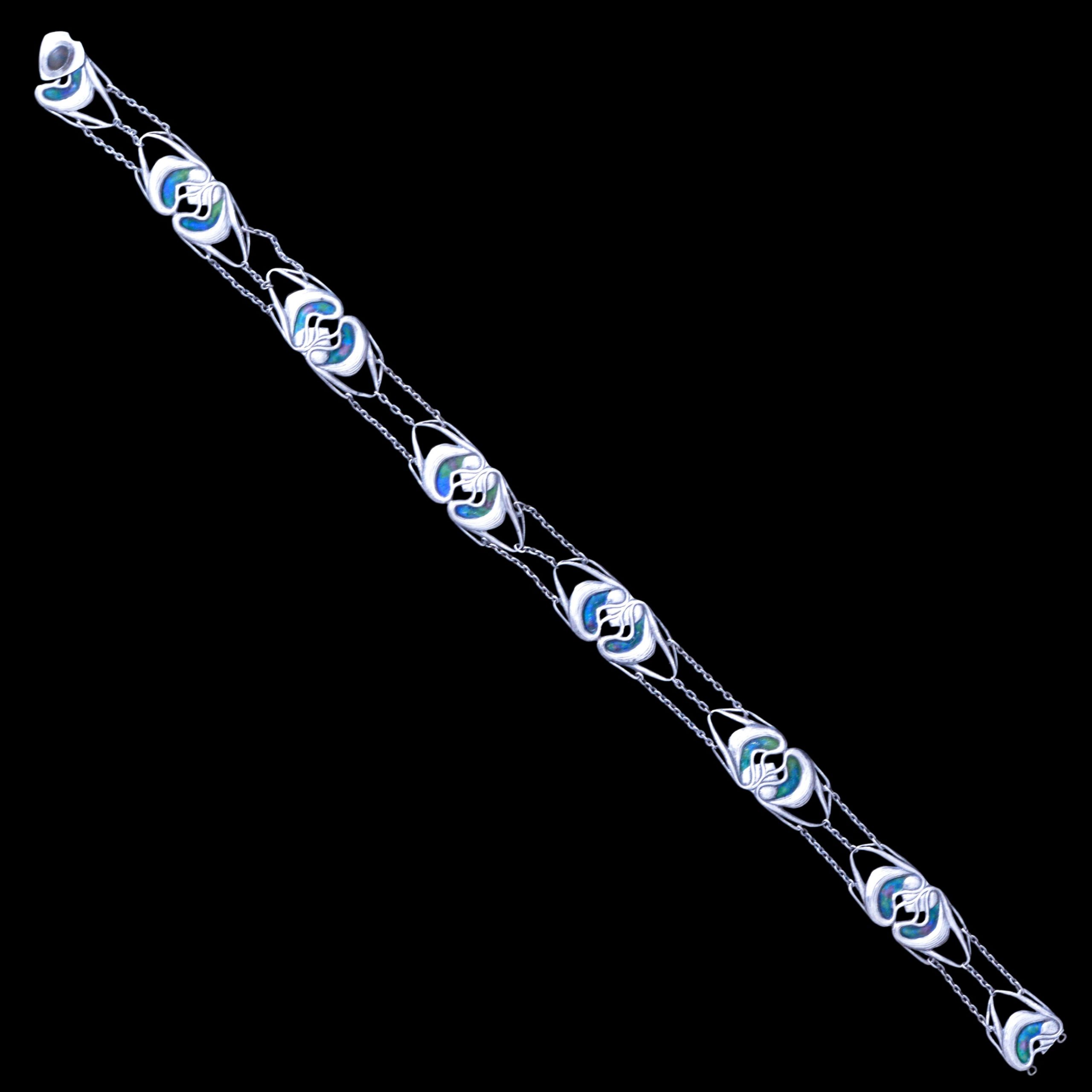 For sale is this beautiful Liberty Cymric silver belt and buckle. The belt is designed in organic art nouveau stlye, with heart motif, and blue green enamel. The buckle similary designed with an overlapping catch holding a stone that I thik is opal or labradorite. I would attribute the belt’s design to David Veazey.