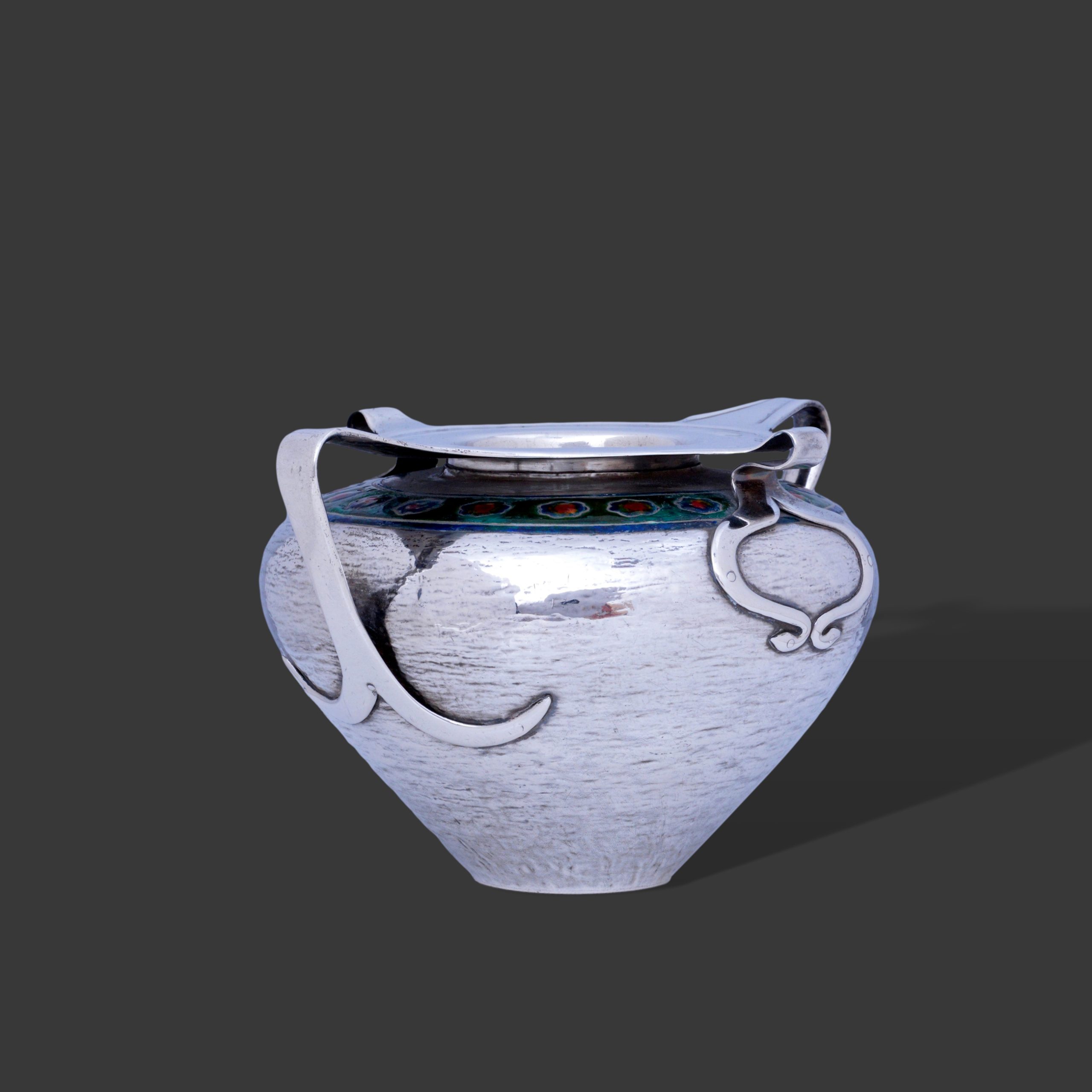 A rare Liberty Cymric large silver vase with enamel rim to the body, marked for Birmingham, 1901. The design by Oliver Baker, this bowl appears in the first illustrated Liberty Cymric catalogue from around 1900, page 35 (see images). This is one of Baker’s designs initially made independent of Liberty’s Cymric range solely for William Hair Haseler, but which then became part of the early Cymric range. Like most of Liberty’s early works by Oliver Baker, the piece is heavy and a very good gauge of silver.