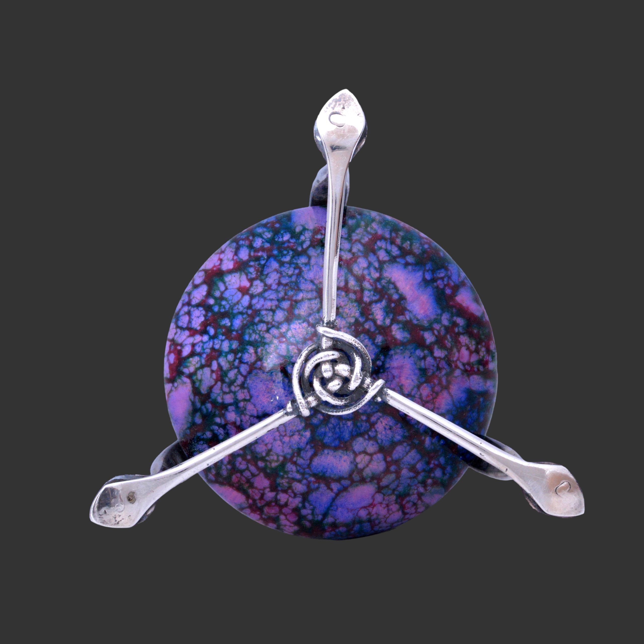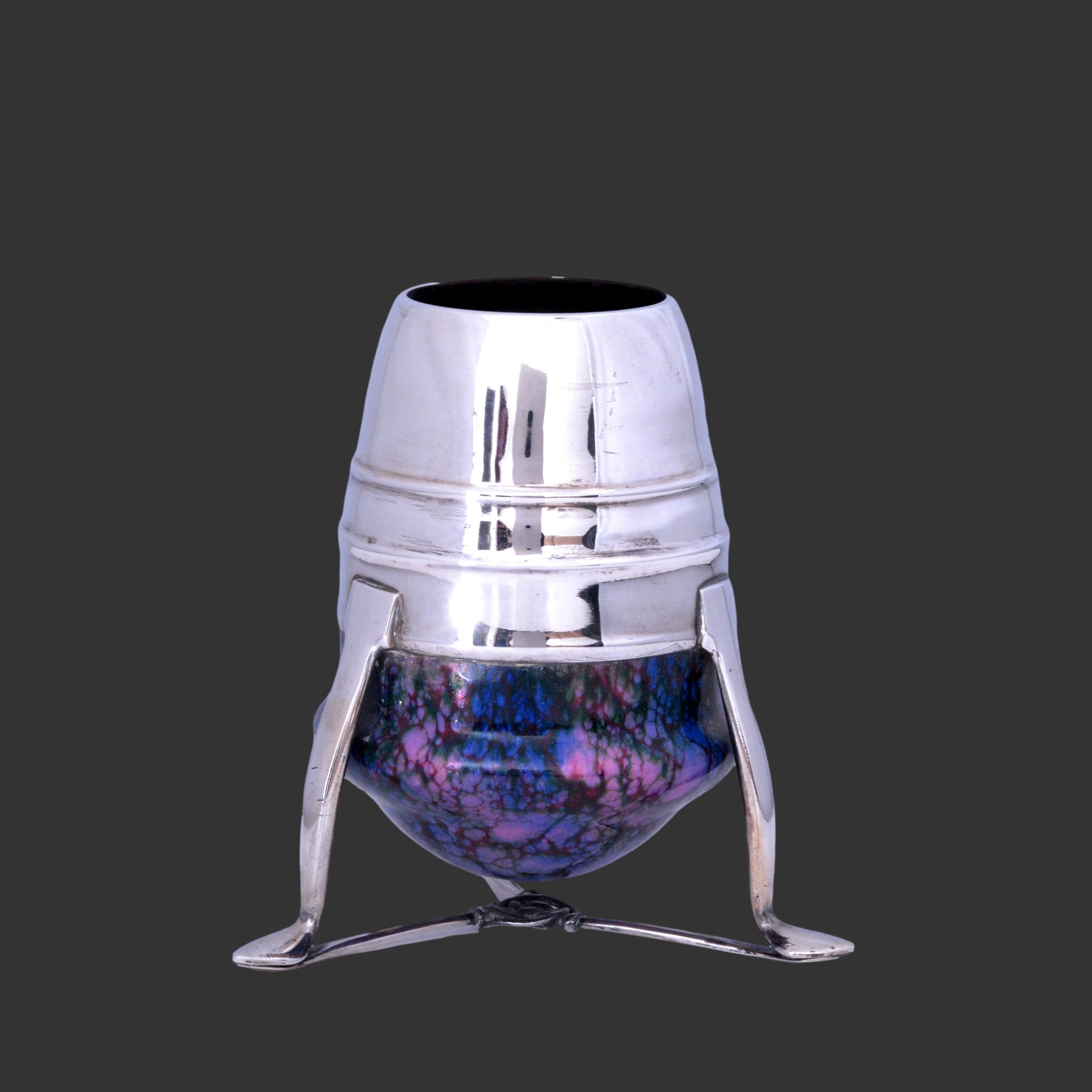 For sale is this extraordinary silver vase by Archibald Knox for Liberty & Co’s Cymric range. The vase is set with a pink purple, marbled, enamel base, the body with ribbed silver and the tripod feet tied together with a Celtic knot of wirework silver. An example of this model appears in Dr Stephen Martin’s book “Archibald Knox”, second edition, page 187.