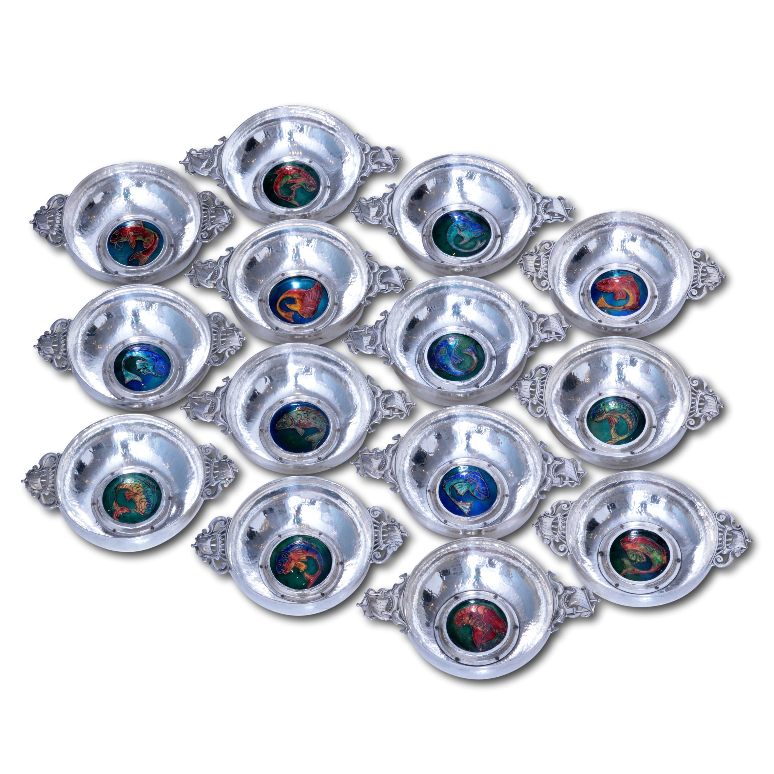 A set of fourteen William Snelling Hadaway silver and enamel dishes