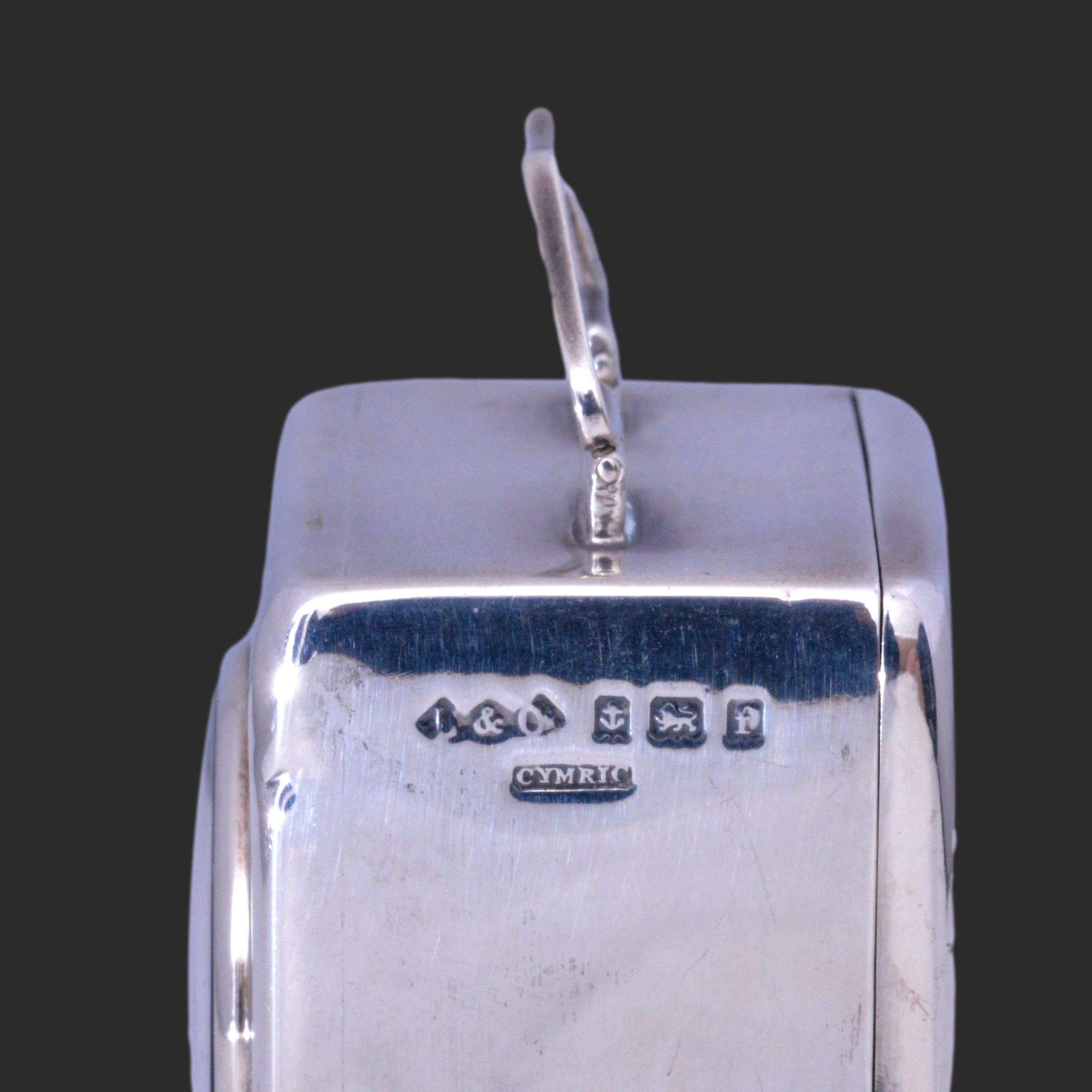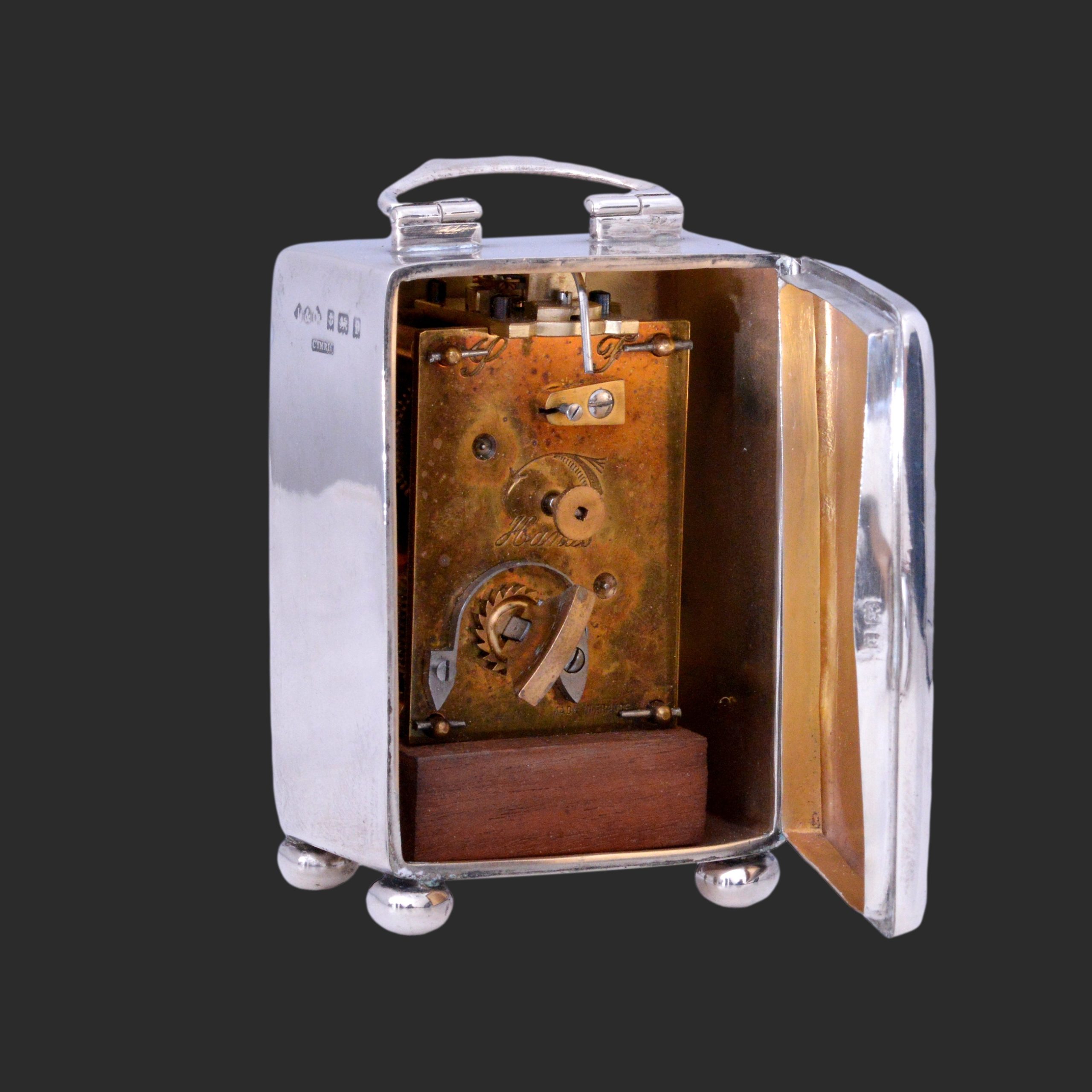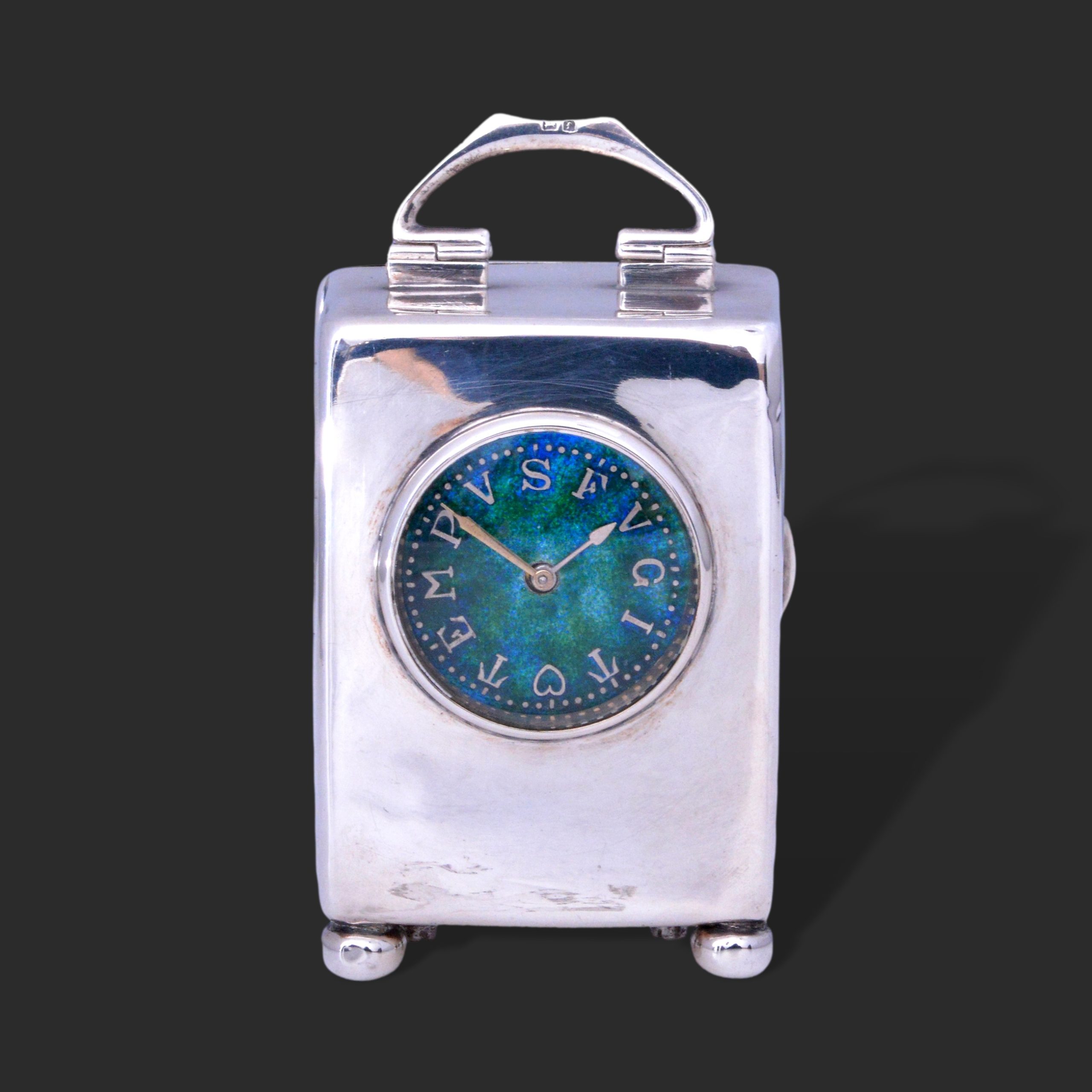 A small silver Liberty & Co Cymric clock, dated Birmingham 1905. It has a particularly nice enamel face with latin Tempus Fugit text instead of dial numbers. Model 5308.