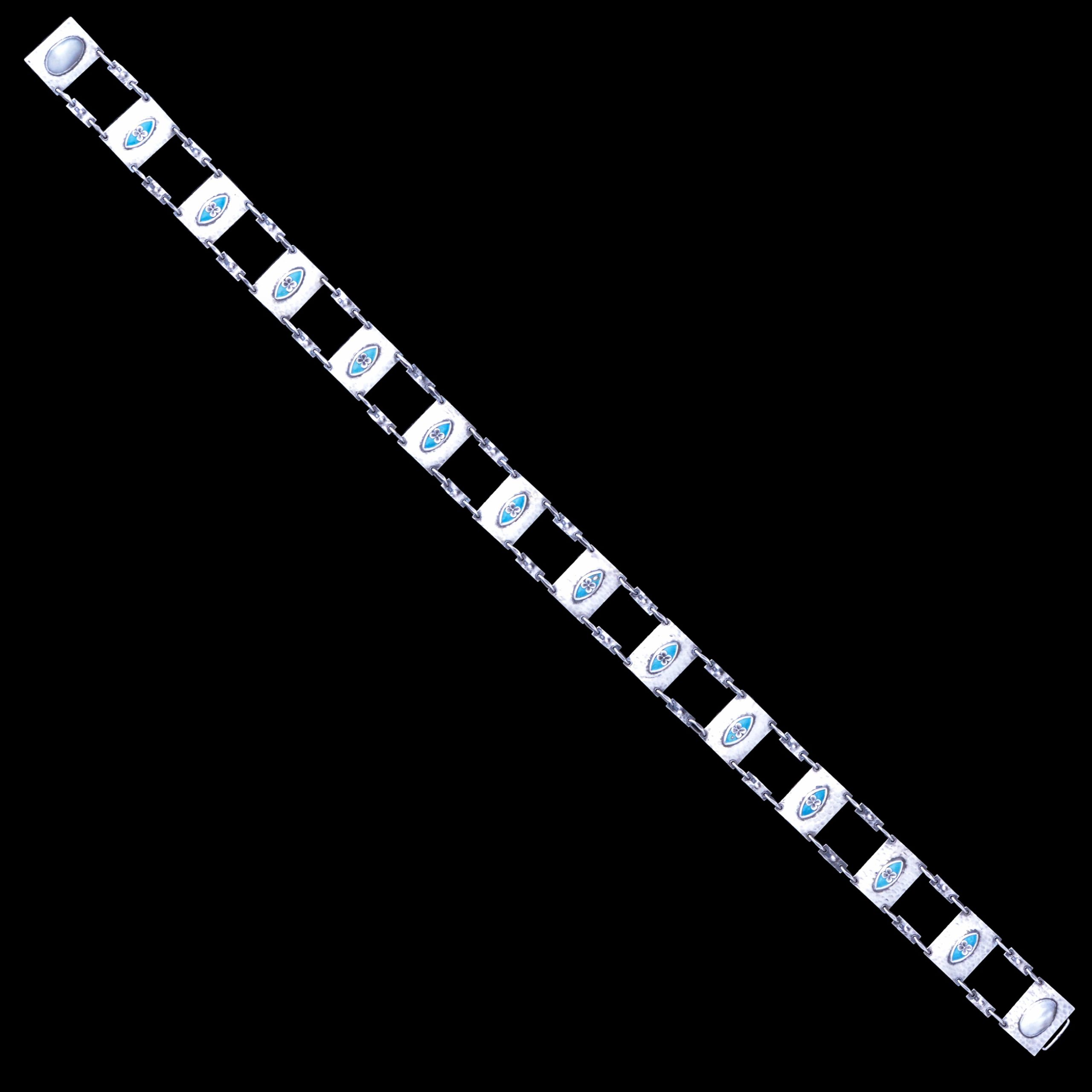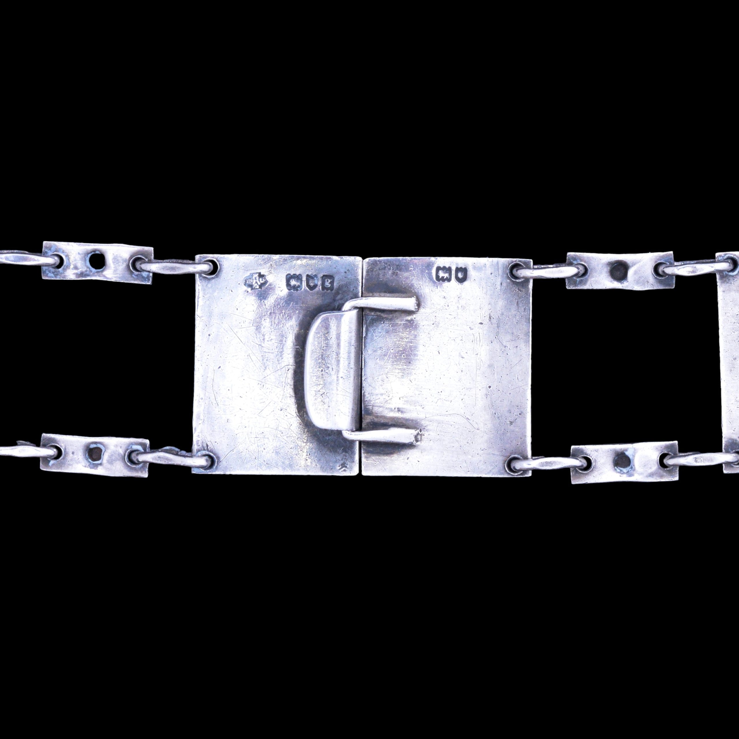You cannot better a good artistic, scupltural, arts and crafts silver buckle and for sale is this really astounding, indeed confounding, silver belt and buckle fully assayed for William Hutton & Sons. It is made of a heavy gauge of beaten sheet silver and, unlike much of Hutton’s commercial work, is very much hand made. The links are each augmented with what is clearly a Kate Harris flower motif with blue enamel. The buckle itself has two inset pieces of rectangular blister pearls to each half, as seen on other Kate Harris pieces. I am not attributing the entire piece to Kate Harris simply becasue the geometric hammered design of the silver is unlike her normal style. I can only assume this is a collaborative piece.