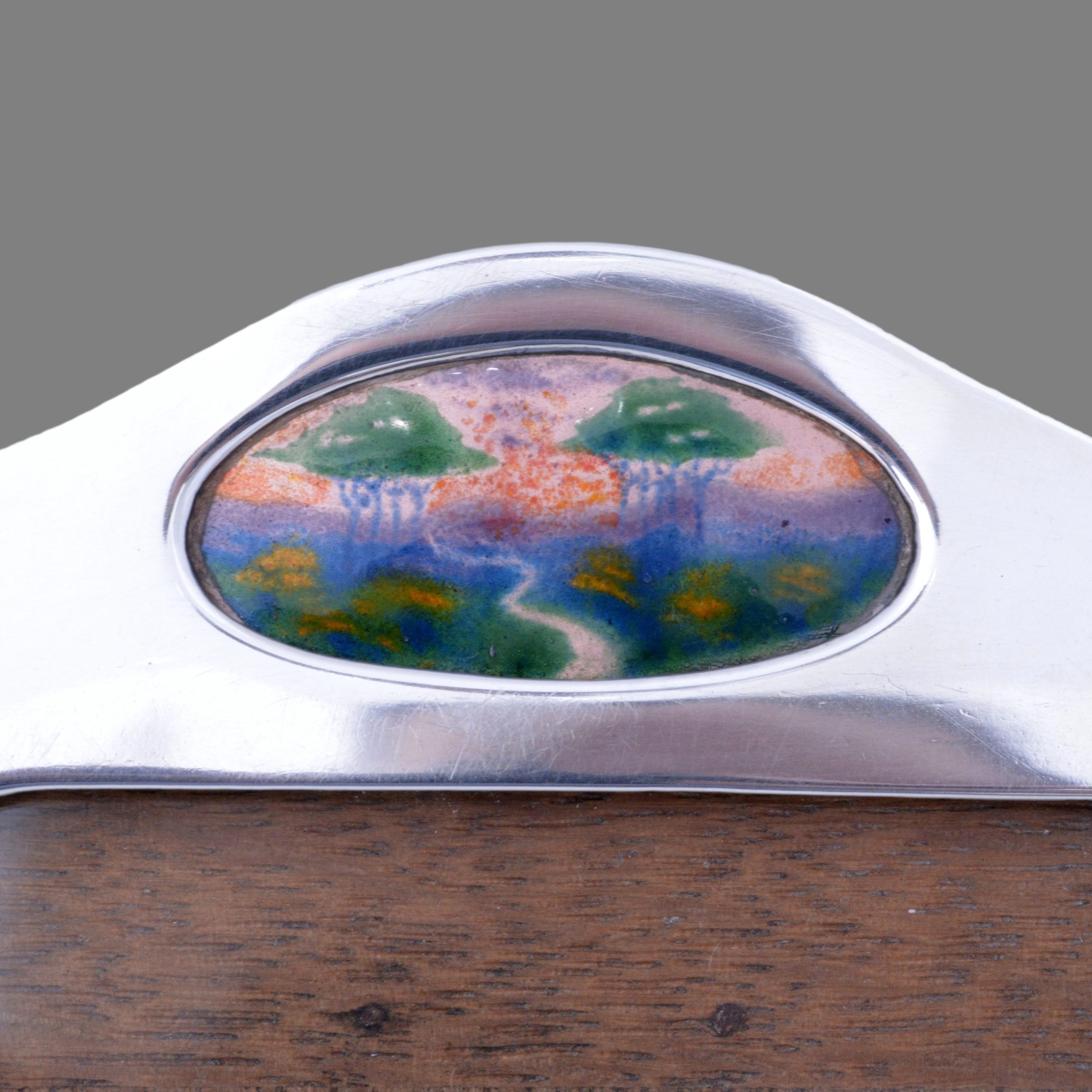 For sale is this exceptional, small, but perfectly formed, William Hutton & Sons silver and enamel rectangular photo frame, set with an exquisite oval enamel landscape in the manner of Fleetwood Varley. It may be by Varley but is unsigned.