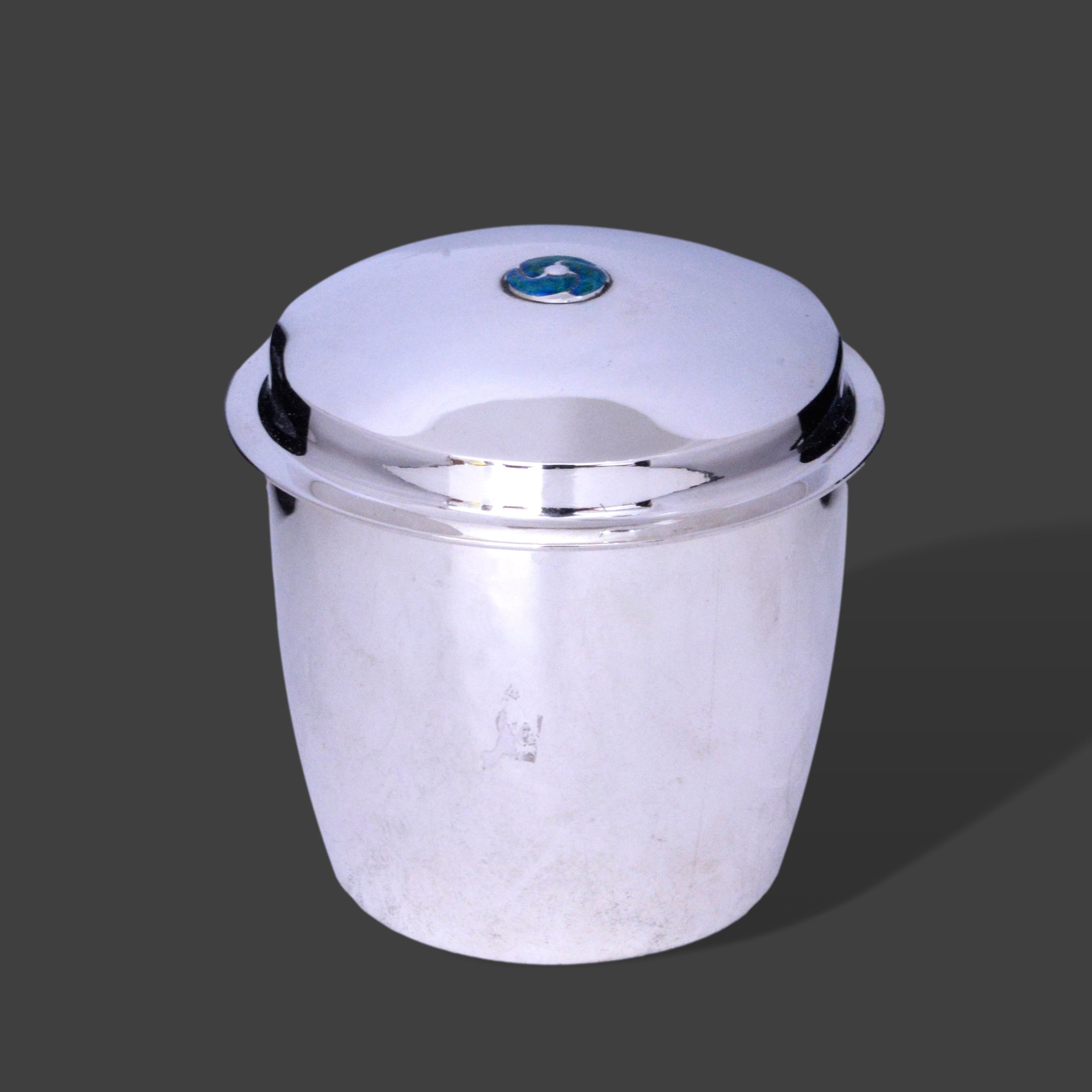 A Liberty & Co silver and enamel tea caddy, the design attributed to Archibald Knox. The lid with Knox design enamel motif. The caddy appears in the Liberty silver sketch book at Westminster Archive number 5064, page 130. This is a striking, large, modernist piece. The condition is excellent.