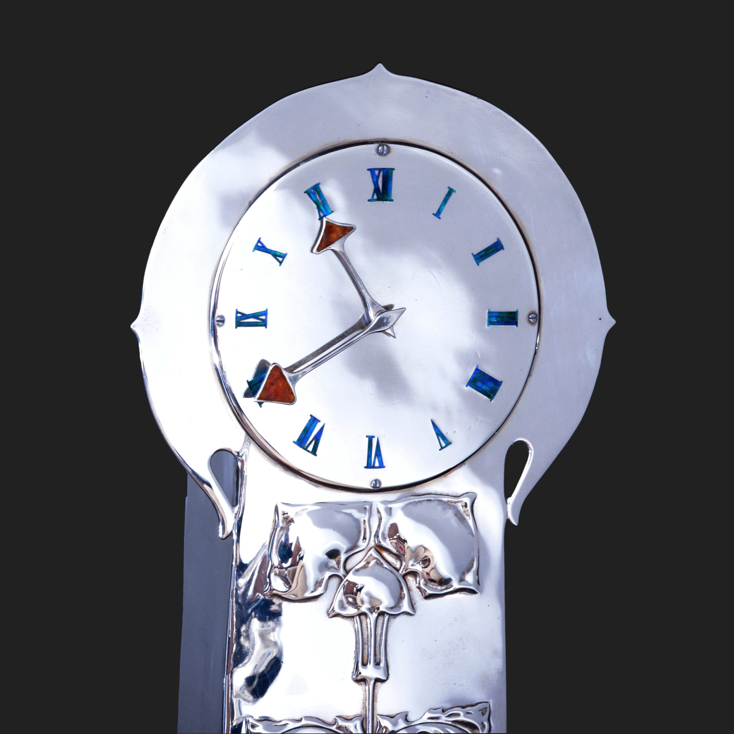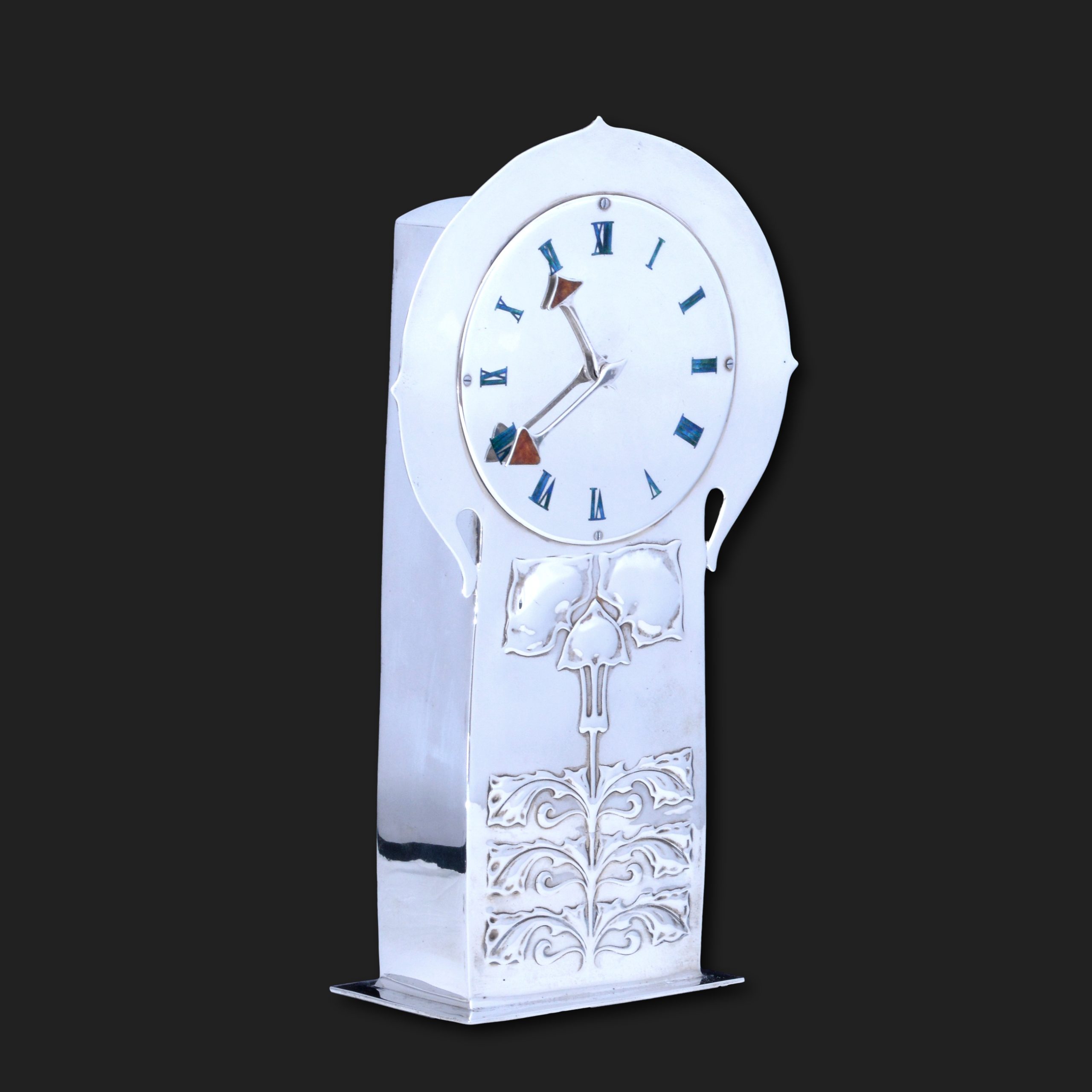 For sale is this large silver Liberty & Co Cymric silver clock, designed by Archibald Knox. The shape of this clock appears to be inspired by the local Isle of Man runic stones and the front is ornamented with an early Knox organic leaf design that can be found in the Silver Studio Archive designs. It is model number 5075 in the Liberty sketch book and appears in Dr Stephen Martin’s book, Archibald Knox, on page 237. The clock is hallmarked for 1903.