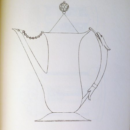 This is one of my favourite Knox designs. Its incredibly modern and whilst it reminds me of the African designs that inspired Mackintosh, I believe it’s inspiration is early Celtic symbolism. See “Archibald Knox”, 2nd Edition, page 251, by Stephen Martin for the same necklace set with turquoise. This is model 8009 in the Liberty jewellery sketch book in the Westminster Archives.