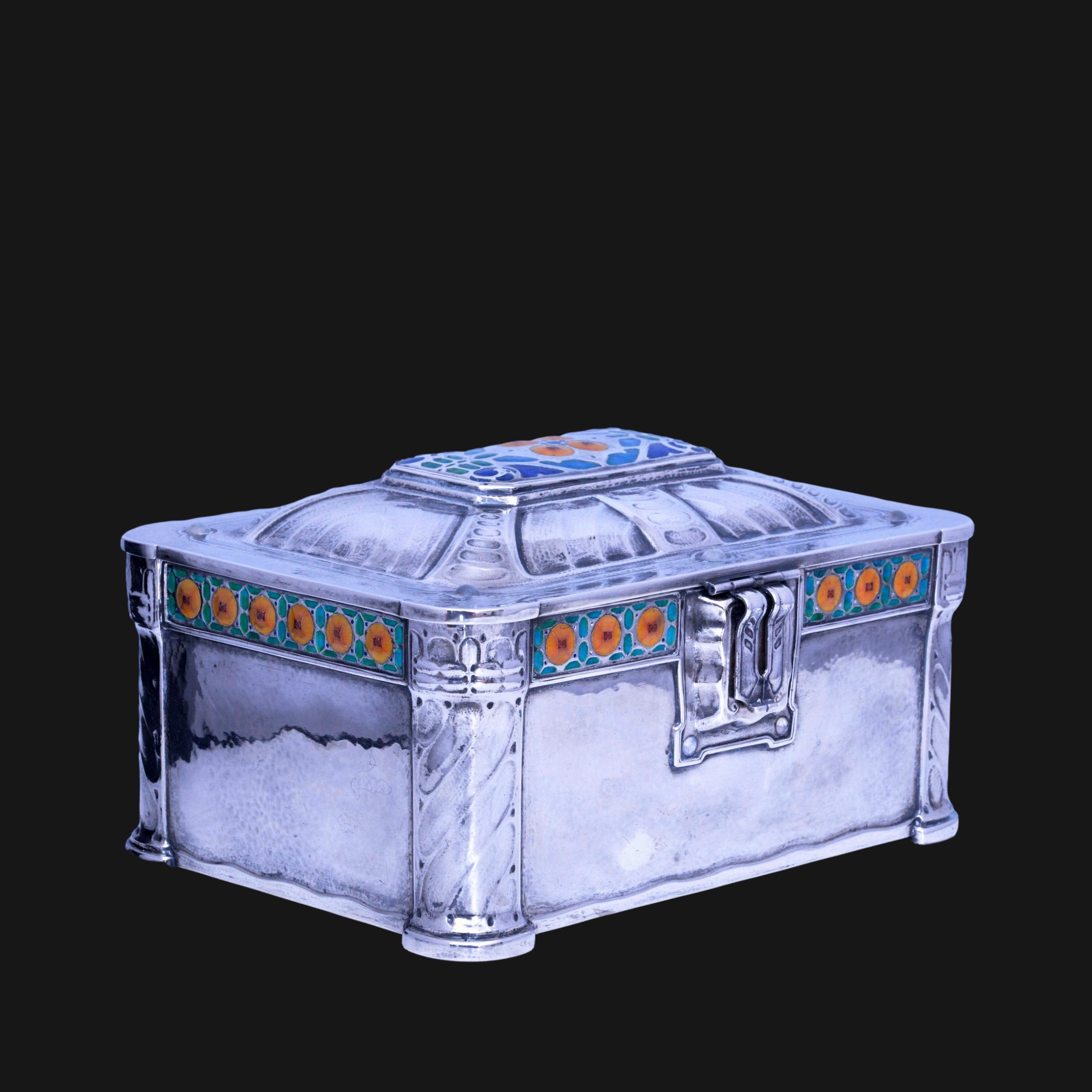 A wonderful Hugo Lundstedt (1876-1969) silver and enamel casket in the arts and crafts tradition. The casket also set with glass (maybe quart or moonstone) cabochons.