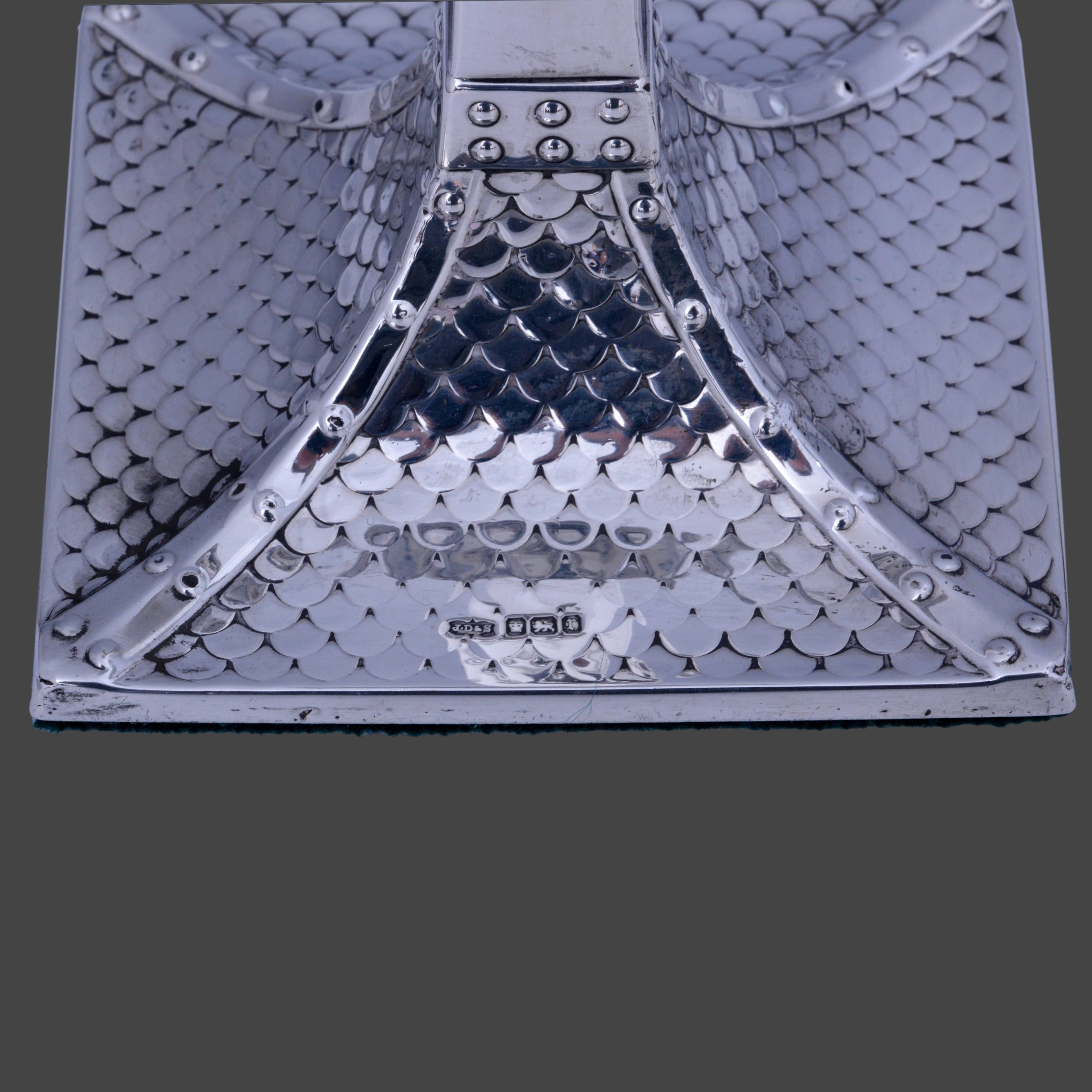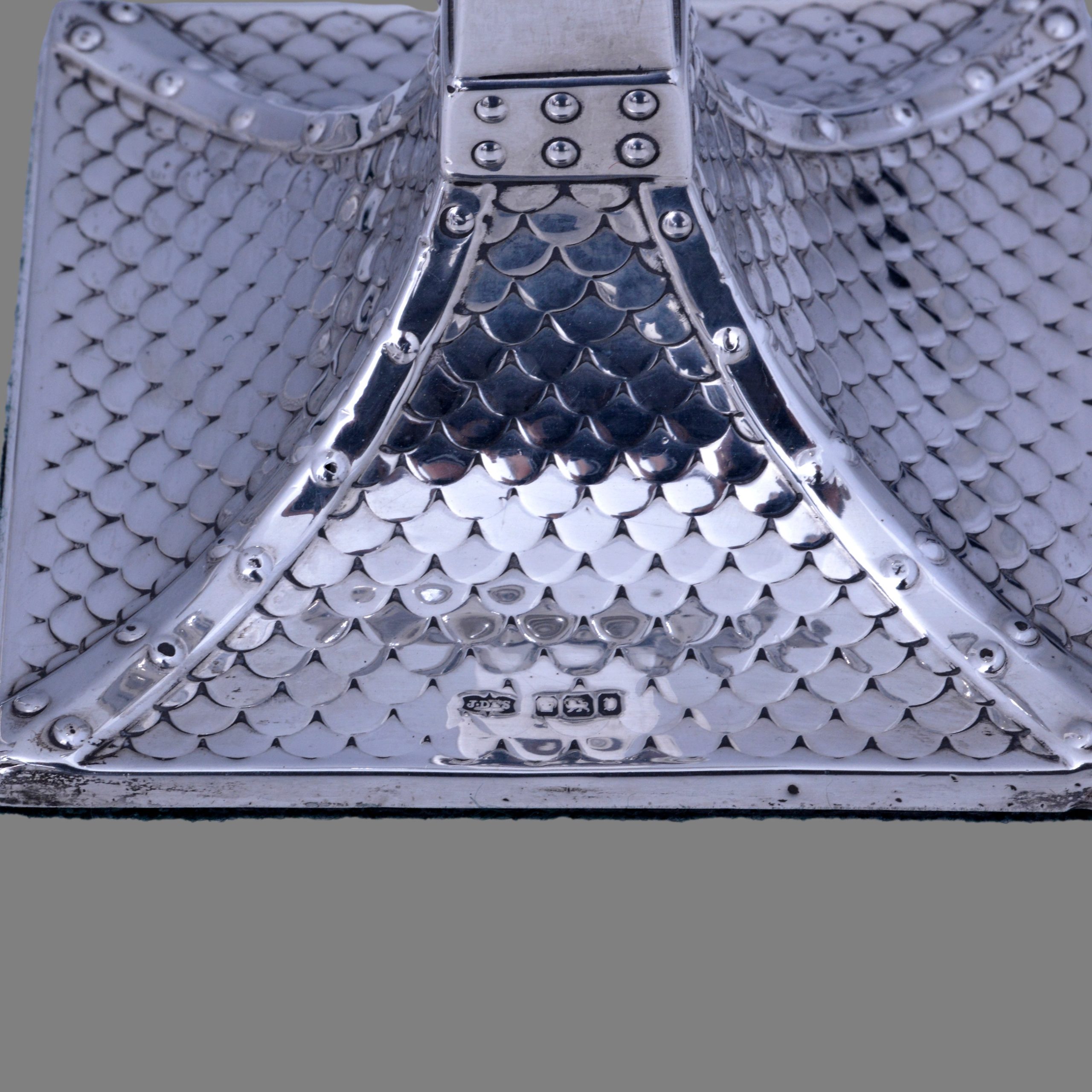 For sale is this classic pair of James Dixon & Sons arts and crafts candlesticks with an unusual twist. Both base and sconce are decorated with a “fish scale” pattern. The unornamented design is attributable to the leading Dutch Amsterdam design school of the period from c. 1902 and copied by the Sheffield firm of James Dixon. These candlesticks are from 1909. The “scales” are possibly inspired by designs from John Paul Cooper and the effect is to create a good play of light.