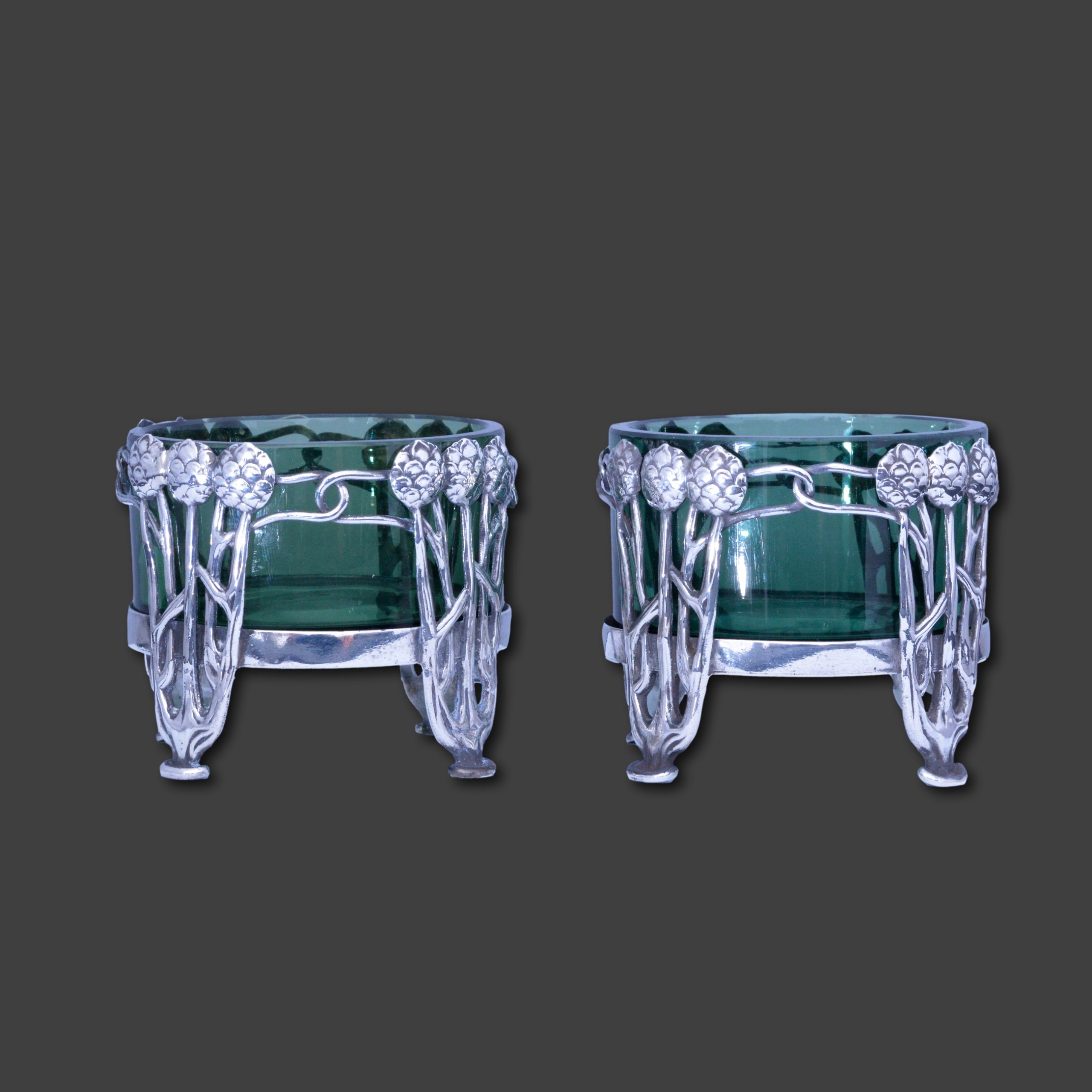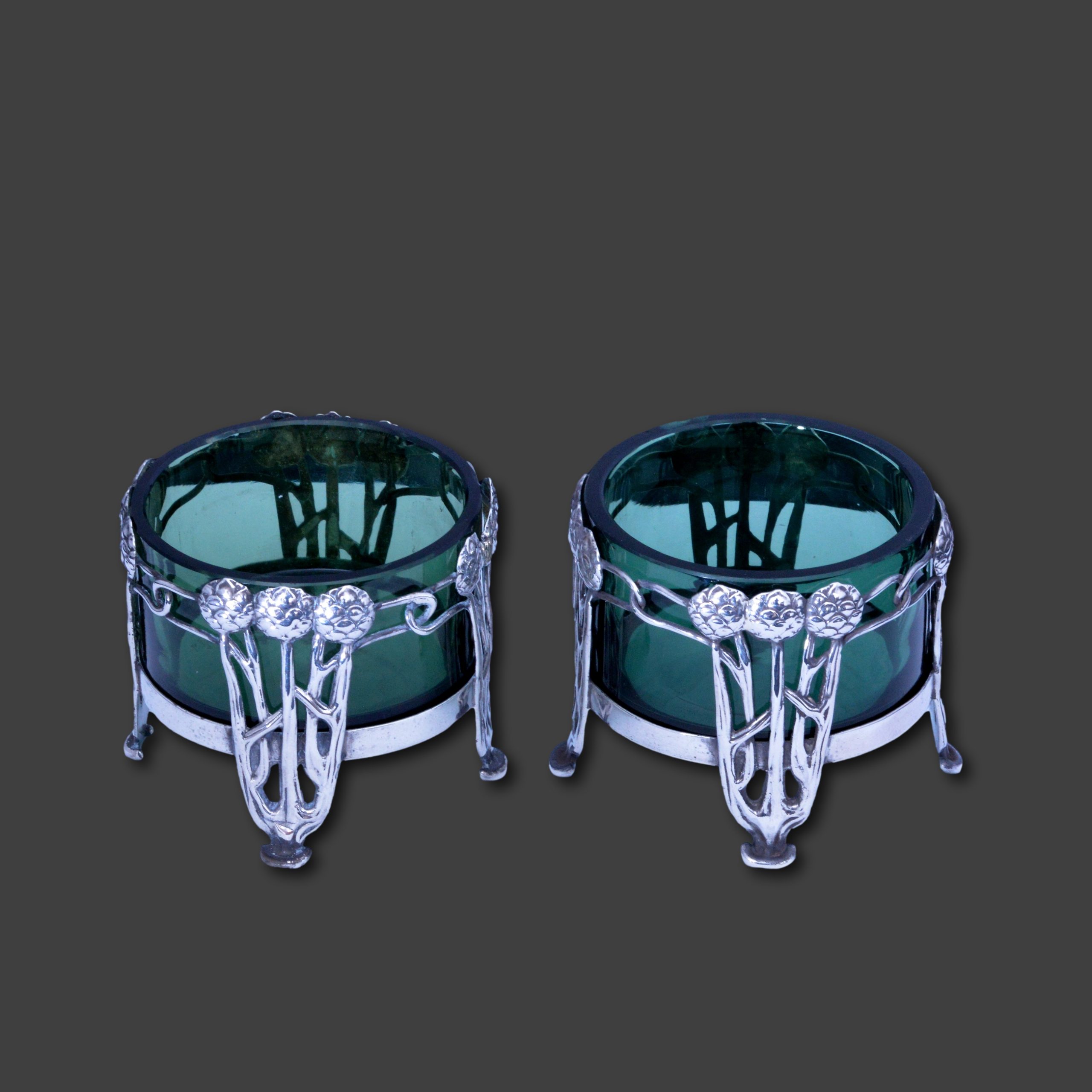 A striking pair of large silver arts and crafts salts by Kate Harris. Hallmarked for William Hutton and Sons, and dated London 1901. These salts have all the characteristics of Kate Harris who designed for William Hutton & Sons c 1899-1903. The glass liners are well matched though one is slightly taller than the other. I believe one is original and one is a very good replacement. Both have very minor chips to rim.