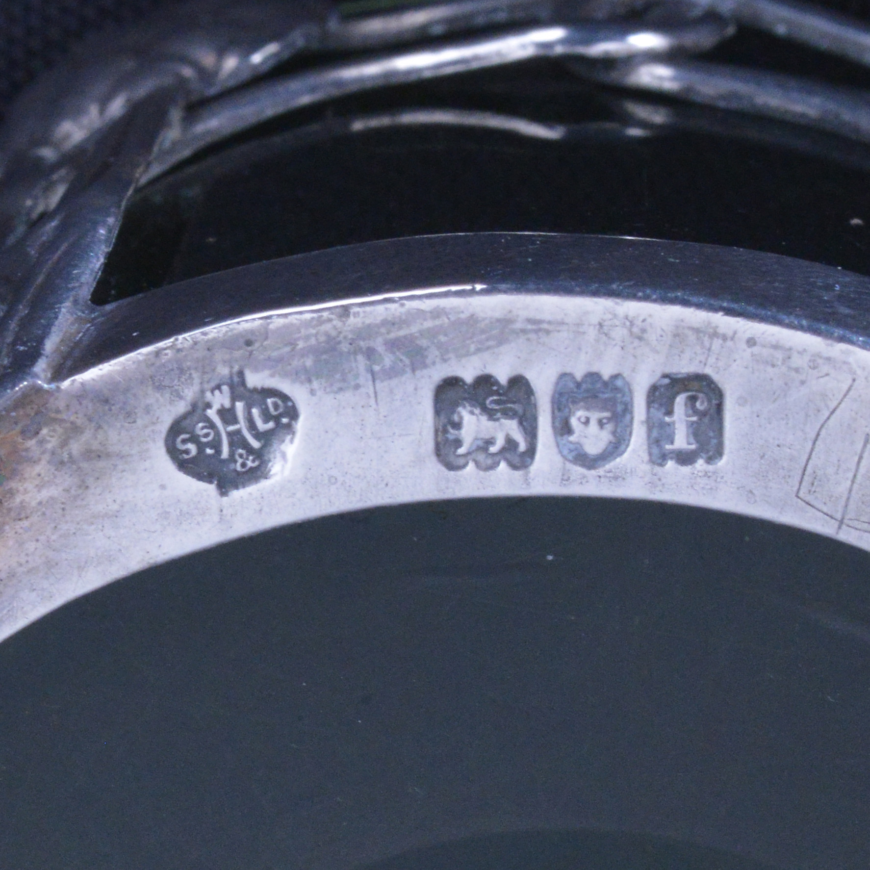 Kate Harris was employed the London studio of William Hutton & Sons to produce artistic silver from 1899 to c 1905. Her work is often hallmarked for Goldsmiths and Silversmiths who were retailers as well as manufacturers. See Dr Stephen Pudney’s article on Kate Harris in the Decorative Arts Society Journal Vol 22 “A marriage of art and commerce: Kate Harris and the arts and crafts silverware of William Hutton & Sons”. By the same author “Connell’s of Cheapside, Pioneers of Artistic Silverware”, Silver Society Journal 1999.